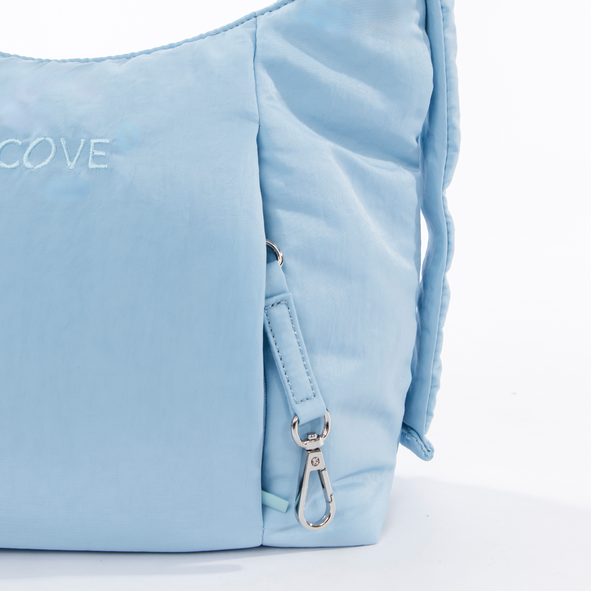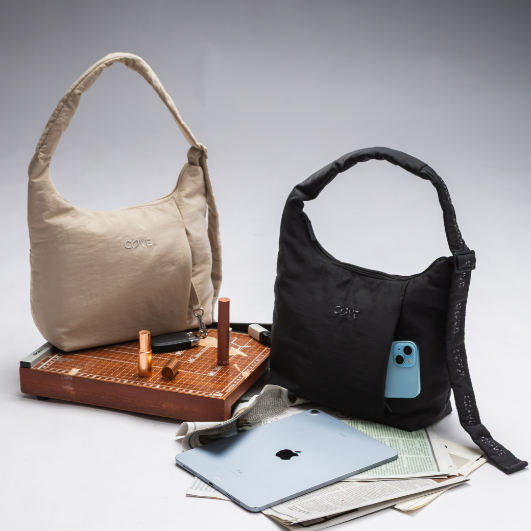 กระเป๋าสะพายทรง Hobo ที่น้ำหนักเบาเพียง 240 กรัม ใช้ผ้า Coated Nylon กันน้ำ 100% พร้อมช่องใส่ของครบครัน รองรับไลฟ์สไตล์ที่เปลี่ยนตลอดวัน